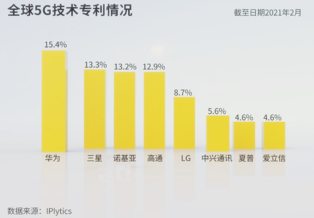 According to data released by the German IPlytics company, among the global 5G technology patents, Huawei occupies 15.4%, and ZTE also occupies 5.6%. These two companies alone account for 21%, which is indeed very pleasing. One scene.